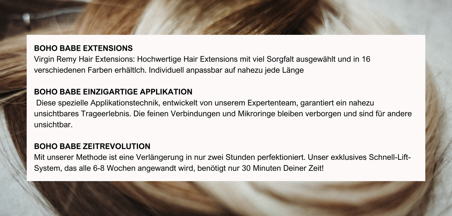 MEHR INFOSIn unserem eintägigen, intensiven Training tauchst Du tief in die Welt der Boho Babe Hair Extensions ein. Carmen und ihr Team teilen ihr umfassendes Wissen und ihre Erfahrungen